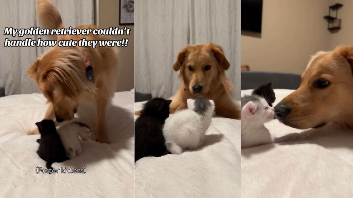 Golden Retriever Overwhelmed by Cute Kittens in Video